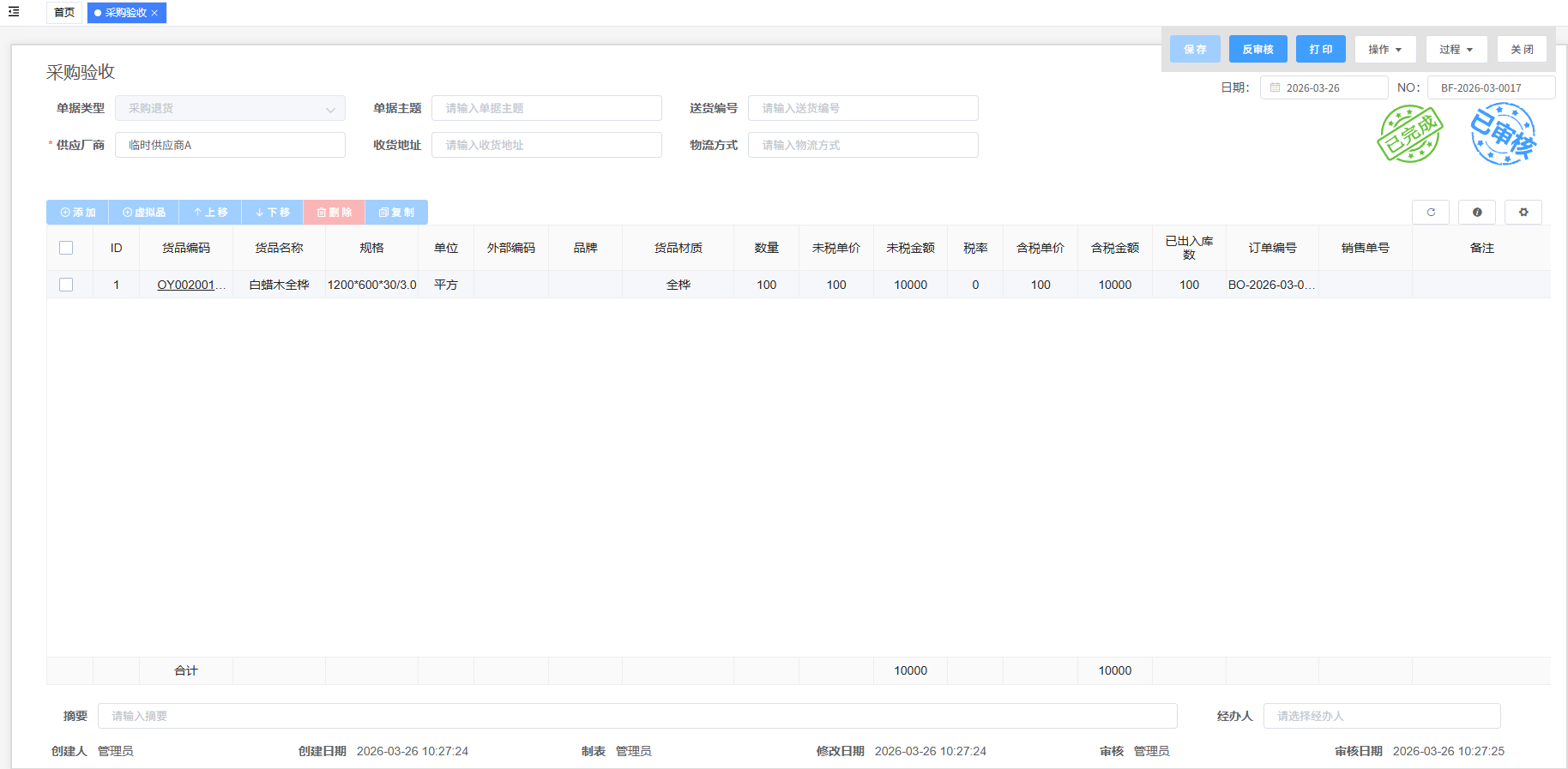 状态反馈: 自动更新对应采购订单的“已收货数量”和状态。