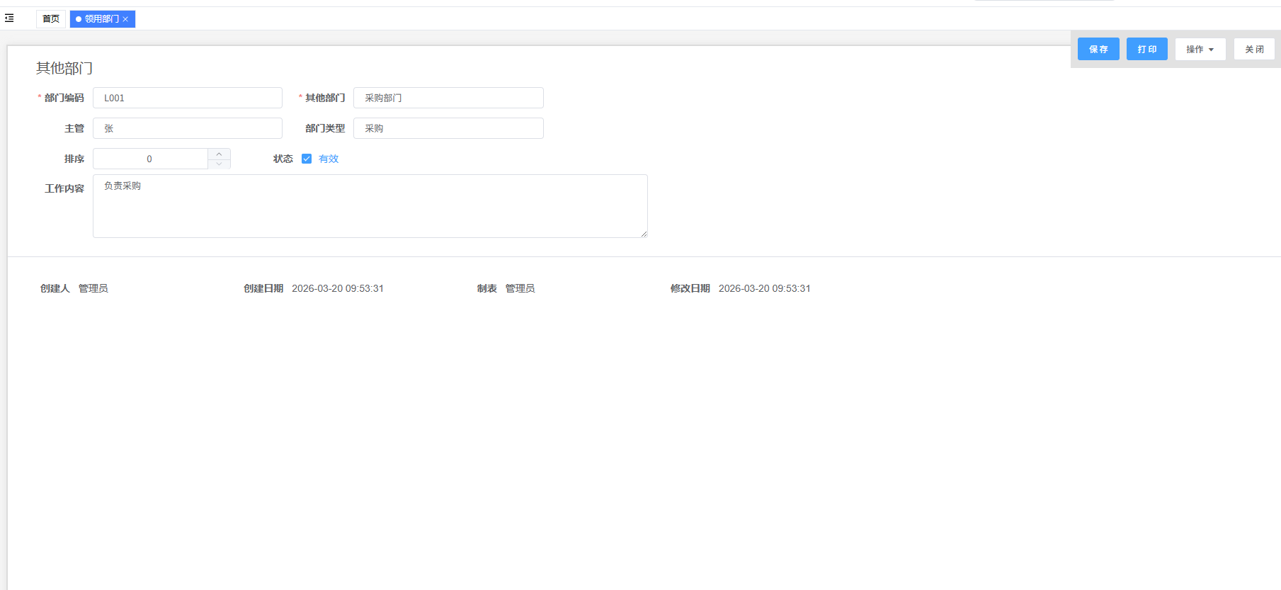路径:“仓库”模块下的“领用部门”