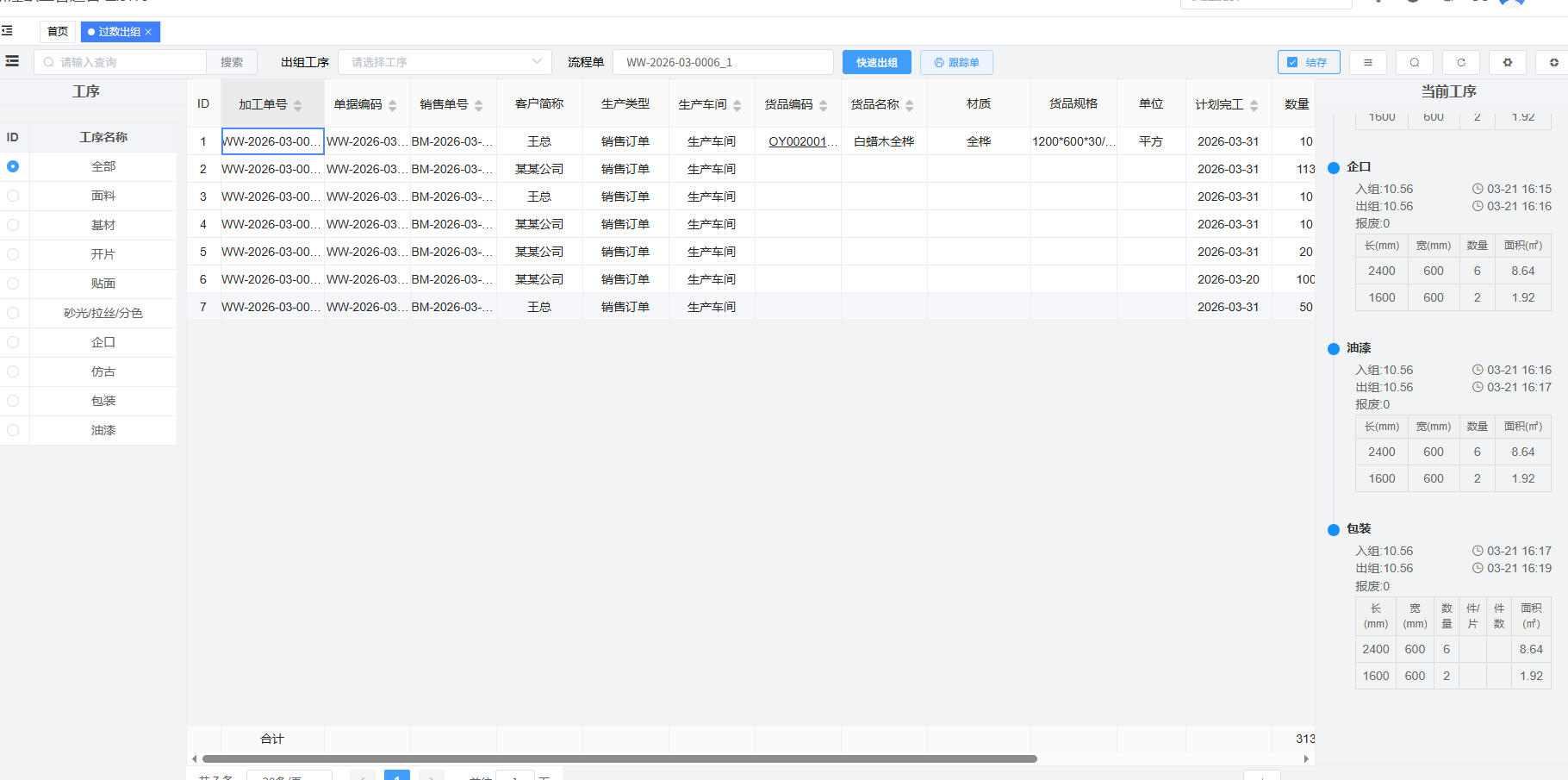 输入:选择“工序”,下方“选择”加工单,然后选择出组(一键出组为全数、标准出组为可选择数量)
