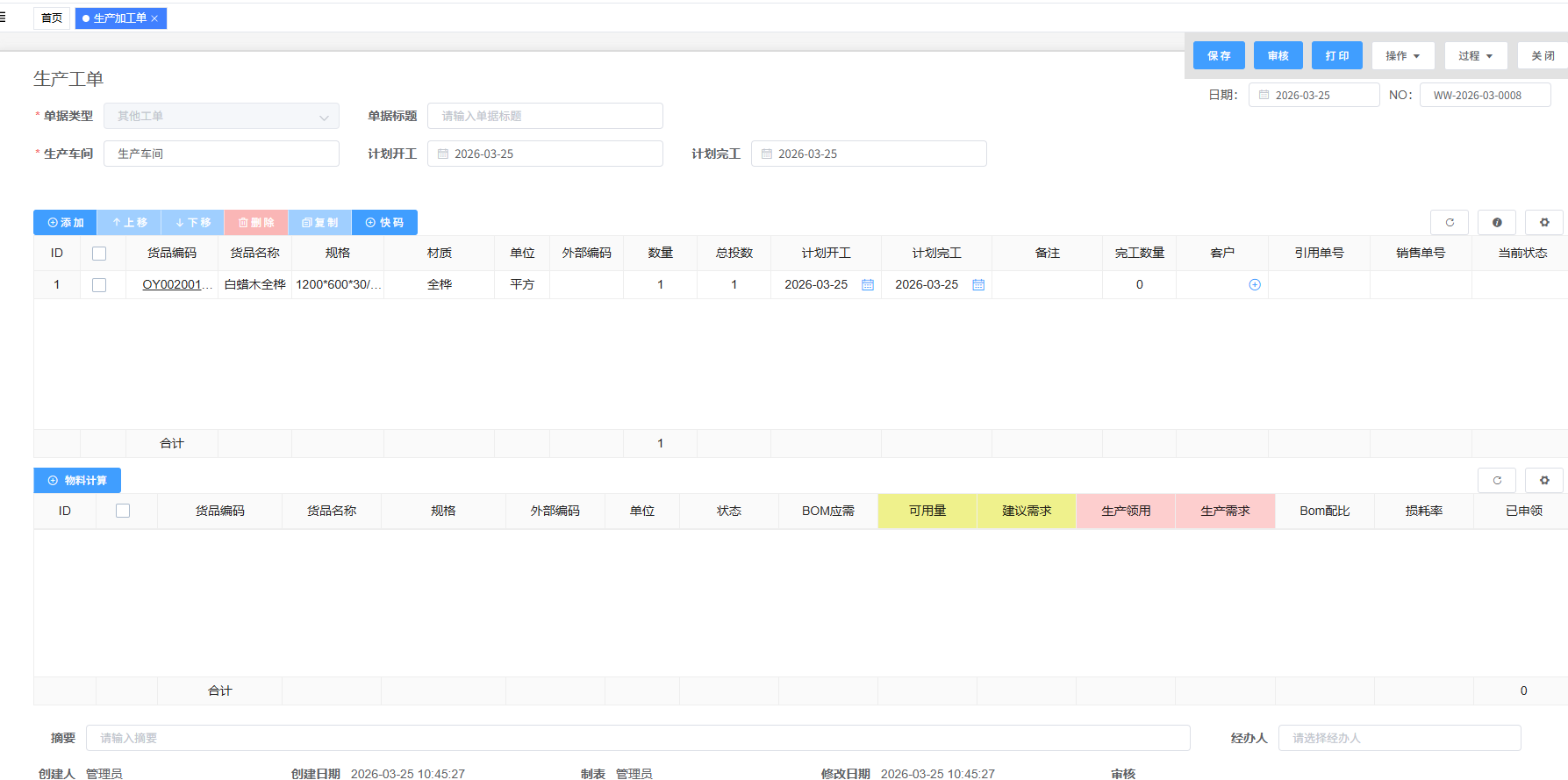 由MRP建议生成或手工创建,关联产品、数量、BOM和
