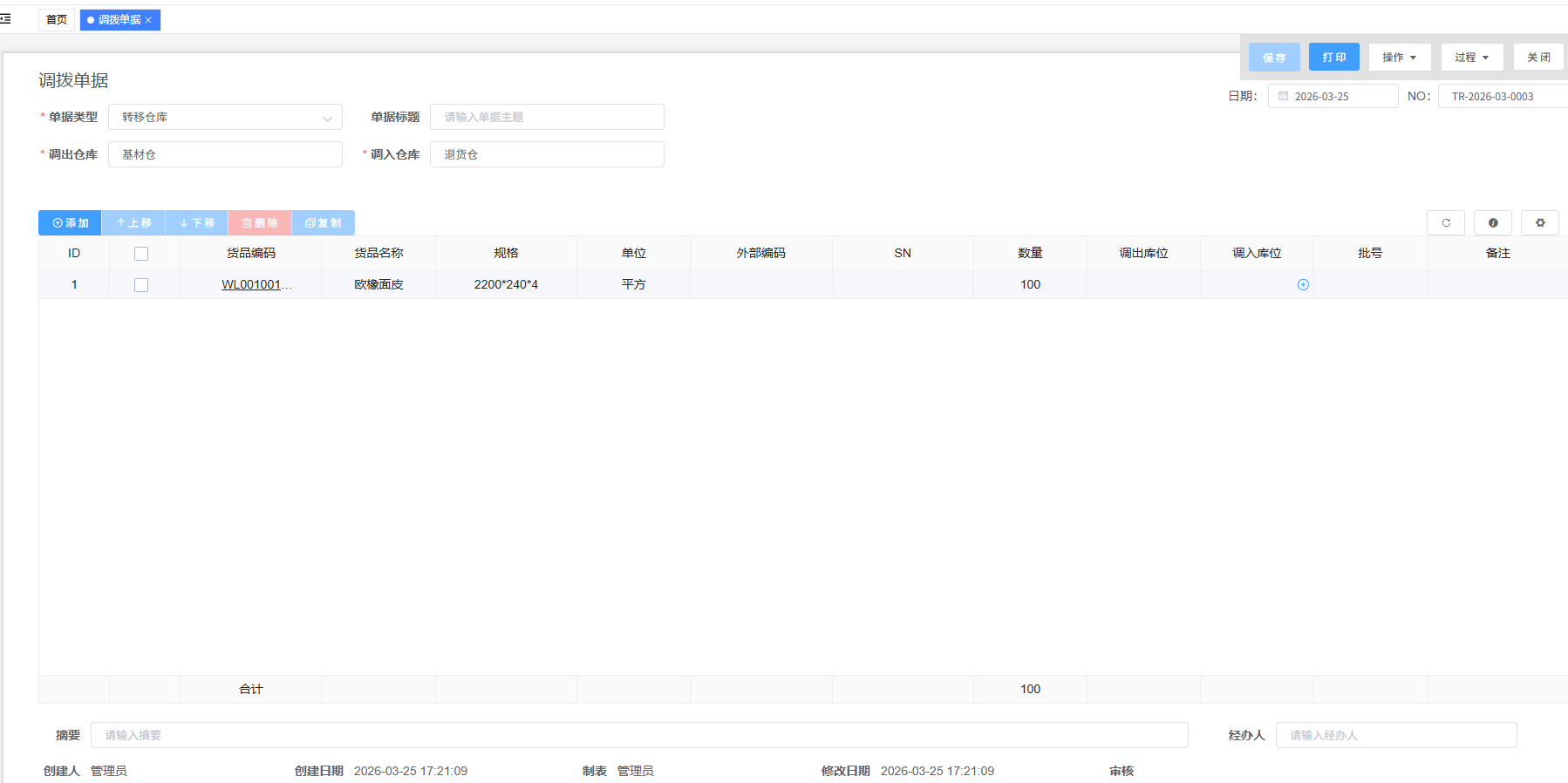 • 跨库调拨: 用于平衡各仓库库存。需要指定调出仓库和调入仓库,并可管理在途库存。