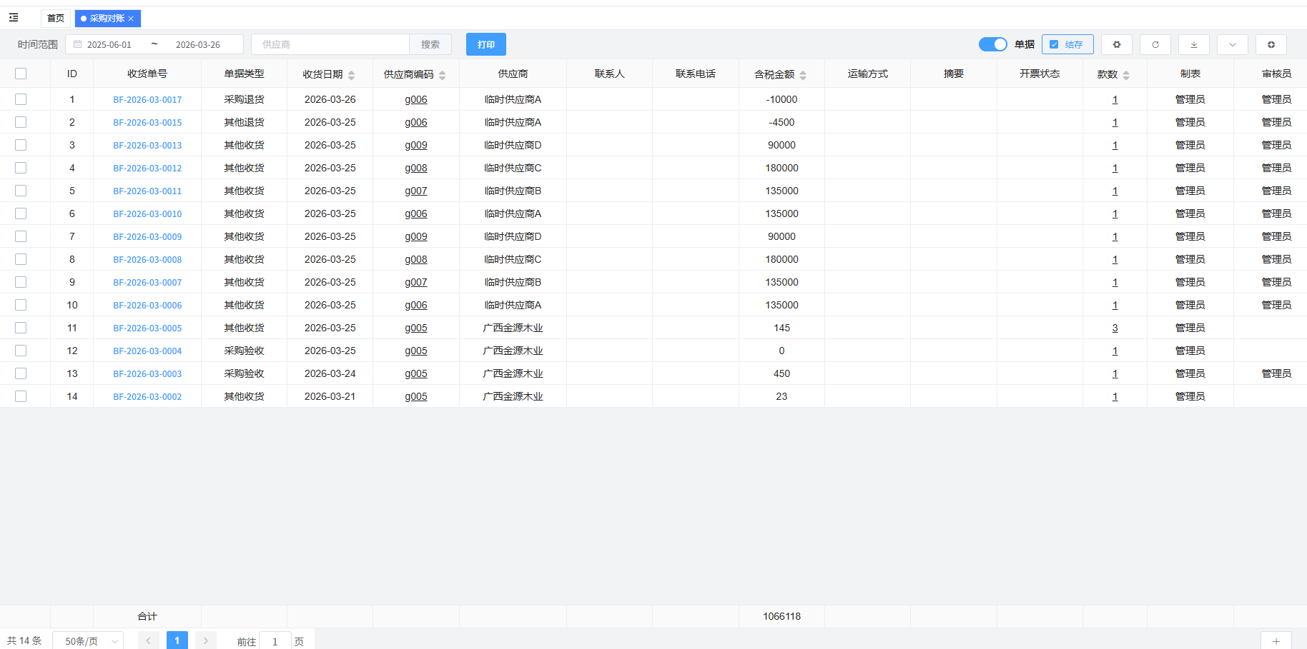 主要用于企业与供应商之间的采购业务对账管理。它整合了ERP系统中的采购管理、库存管理、财务管理、供应商管理等多个模块的数据,提供采购收货、退货等单据的对账功能,支持按时间段、供应商等维度筛选对账数据,帮助采购人员、财务人员准确核对采购金额、数量、开票状态等关键信息,确保与供应商的账务一致。