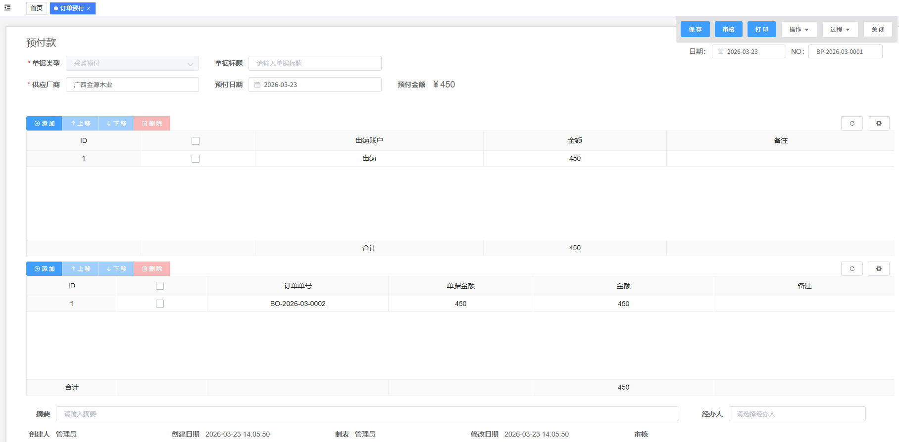 - 路径:“财务”模块下的“预付款”