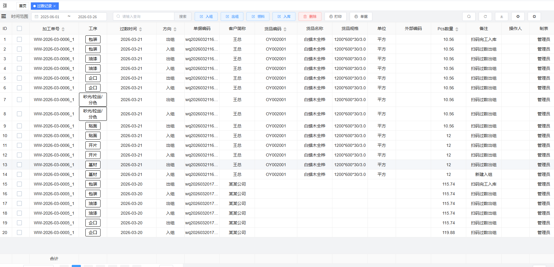 路径:“生产”模块下的“过数记录”