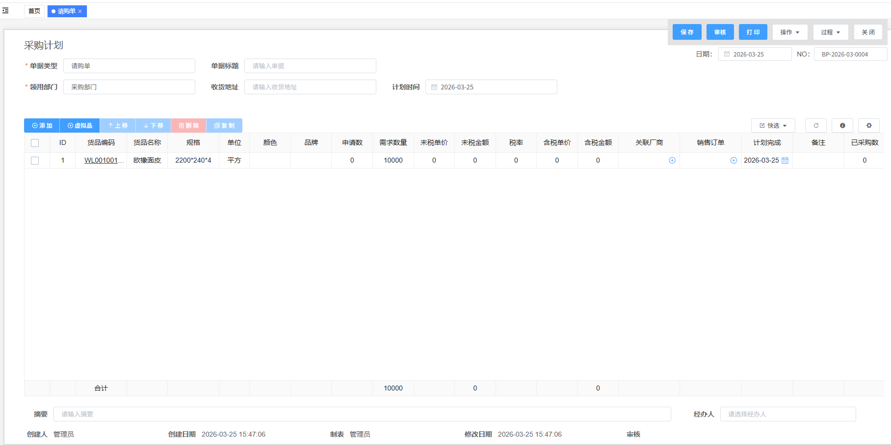 - 单据创建: 需求用户可方便地创建请购单,需填写物料编码、描述、数量、需求日期、需求原因、预算科目等信息。