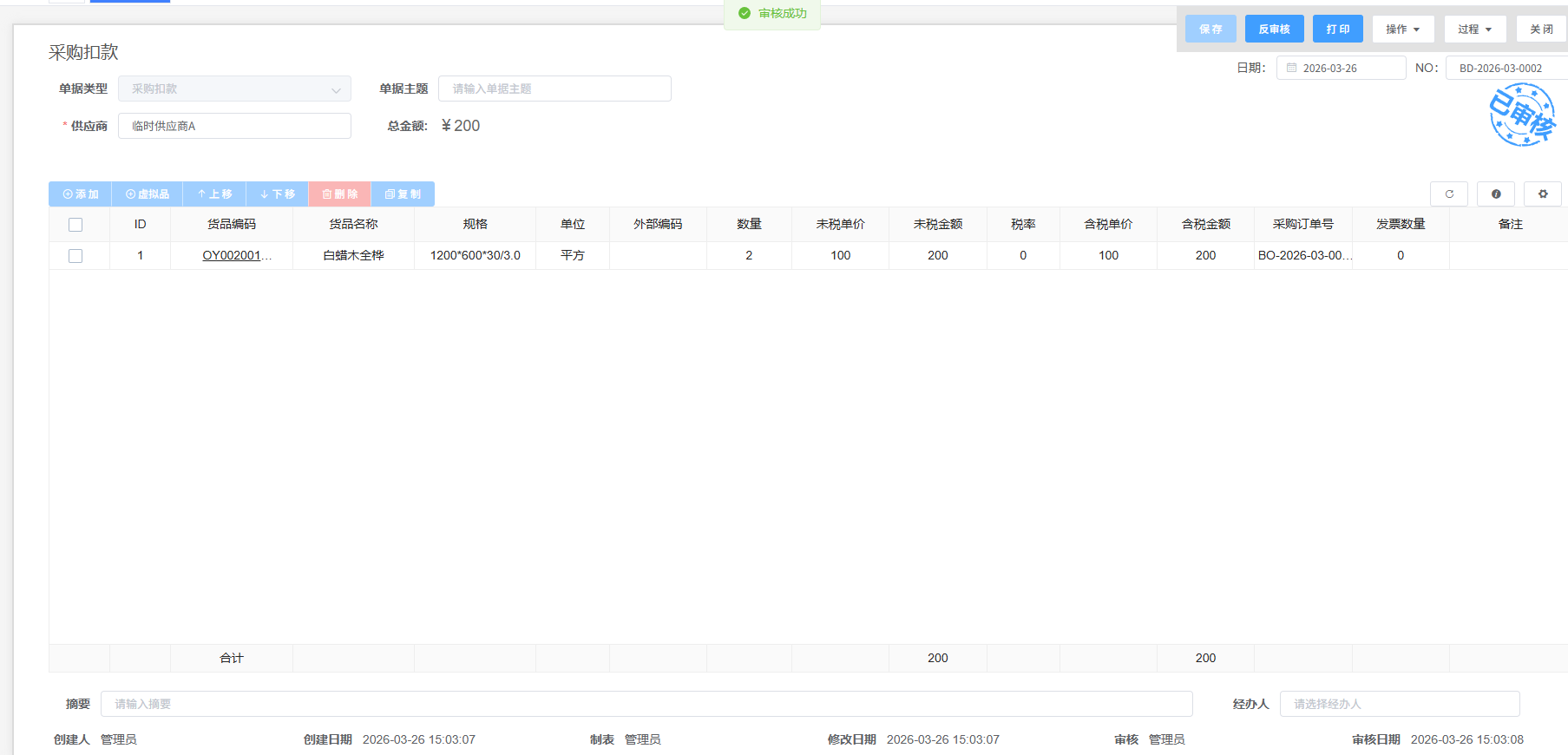 • 关联结算: 审批通过的扣款单,在对应供应商发票结算时,系统会自动计算并抵扣应付金额。
