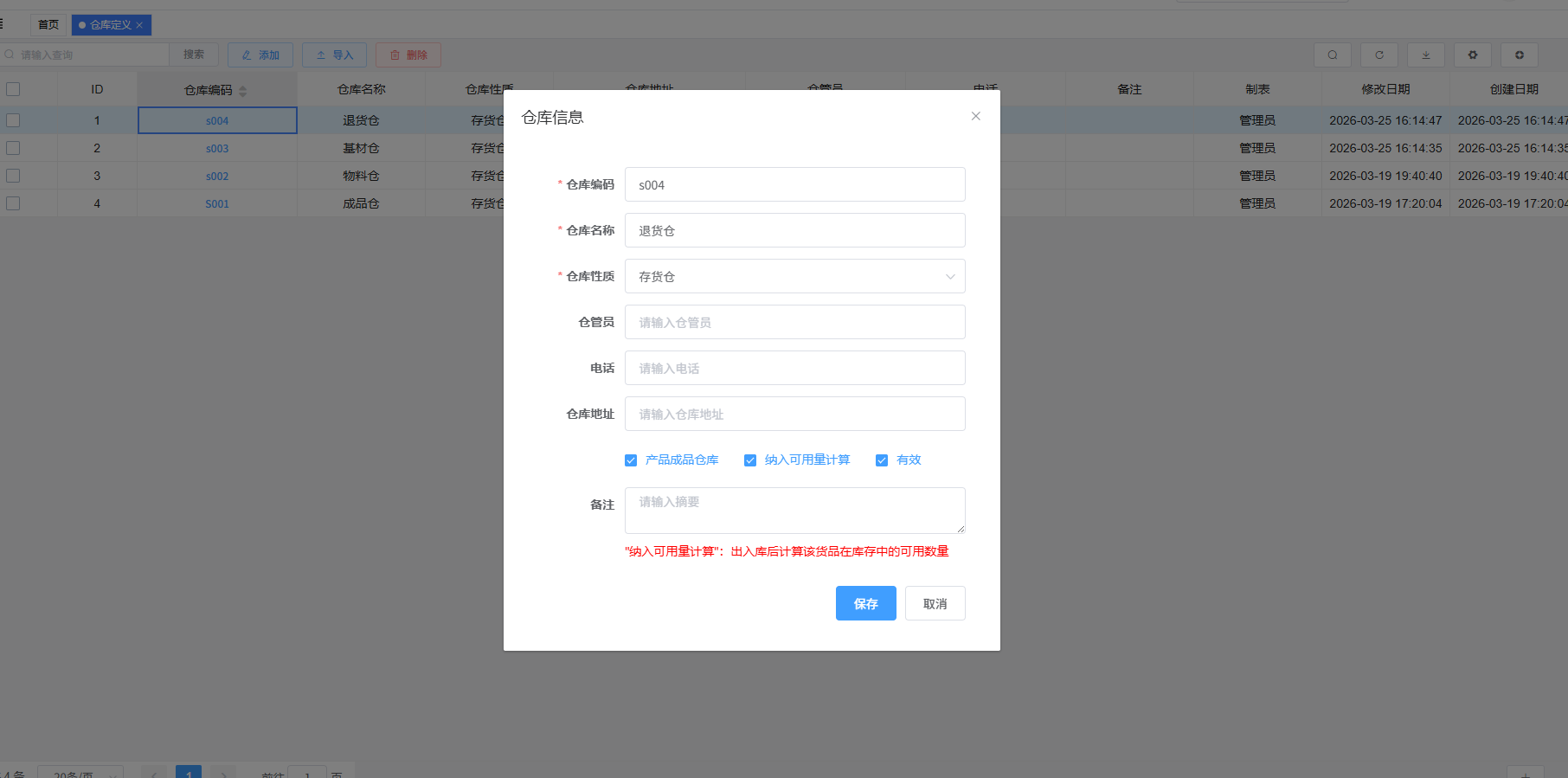 创建物理仓库(如:上海成品仓、北京原材料仓)或逻辑仓库(如:待检仓、不良品仓、虚拟仓)。