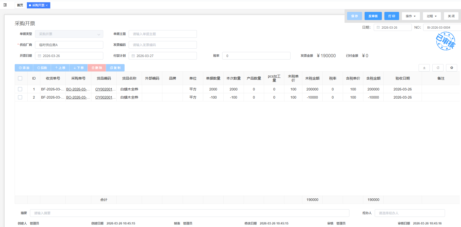 - 确认:点击上方“保存”,单据建立完成,在单据建立完成后点击“审核”