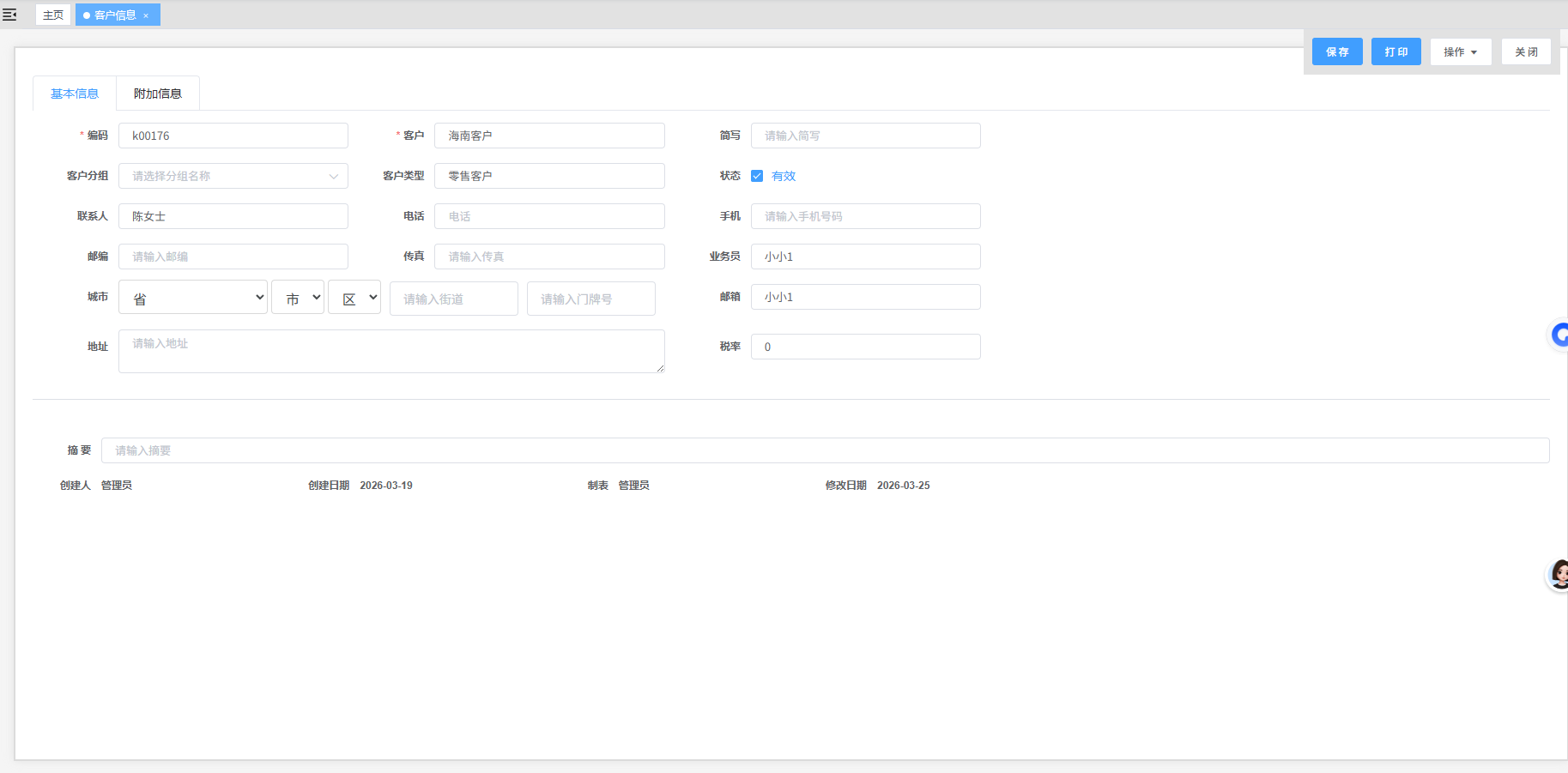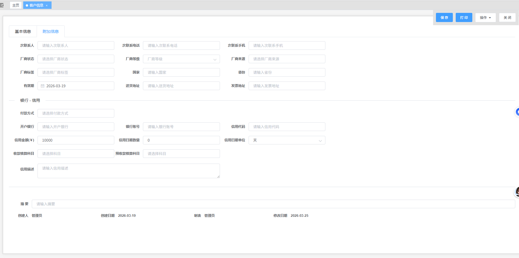 - 输入:点击上方“添加”,填写“编码”、“客户名称”、“简写”、“联系人”、“历史交易记录”、“信用额度”、等