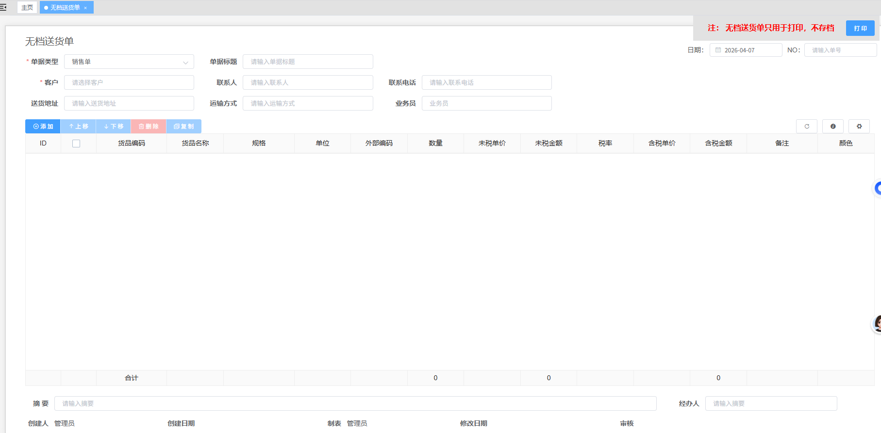 无档送货单是系统中面向销售场景的轻量化单据工具,核心定位是仅用于打印输出、不做系统存档的临时送货凭证,满足企业快速开具送货单据、无需留存系统数据的业务需求,适用于临时性、一次性的送货场景。