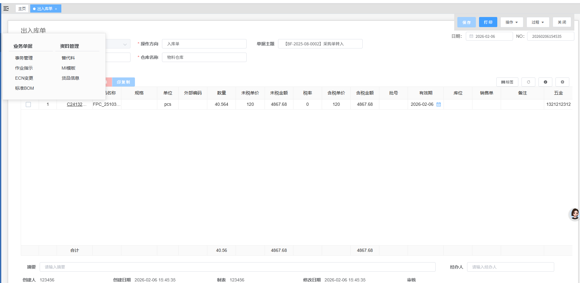 处理所有物料出入库业务的通用单据,是库存数量增加减少的唯一凭证。