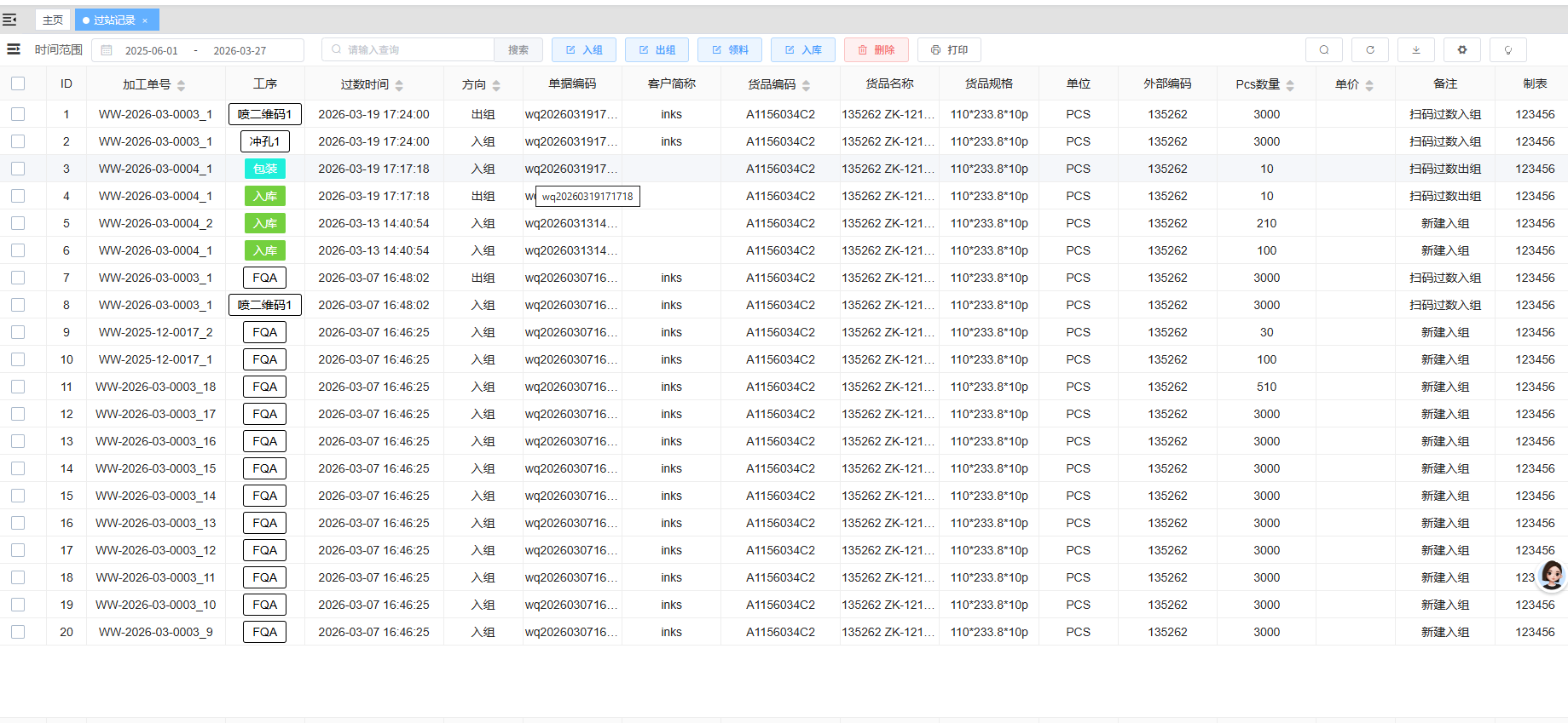 路径:“生产”模块下的“过数记录”
