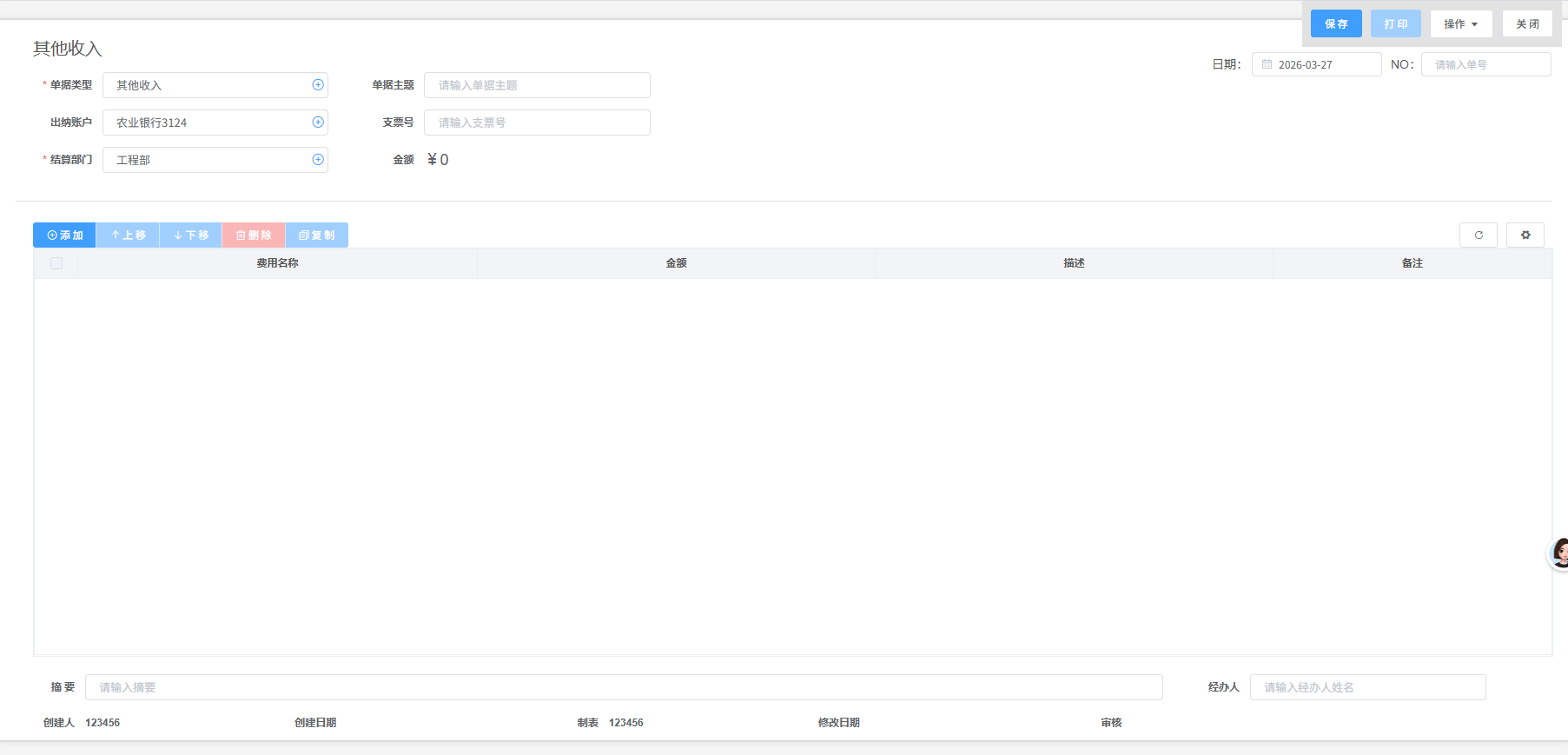 手工创建收款单,选择对应的“其他收入”类结算项目和会计科目。