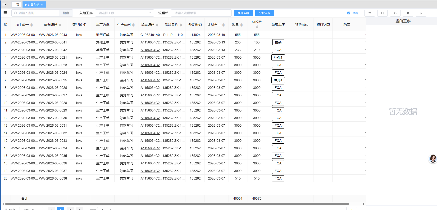 输入:选择“工序”,下方“选择”加工单,然后选择入组(一键入组为全数、标准入组为可选择数量)