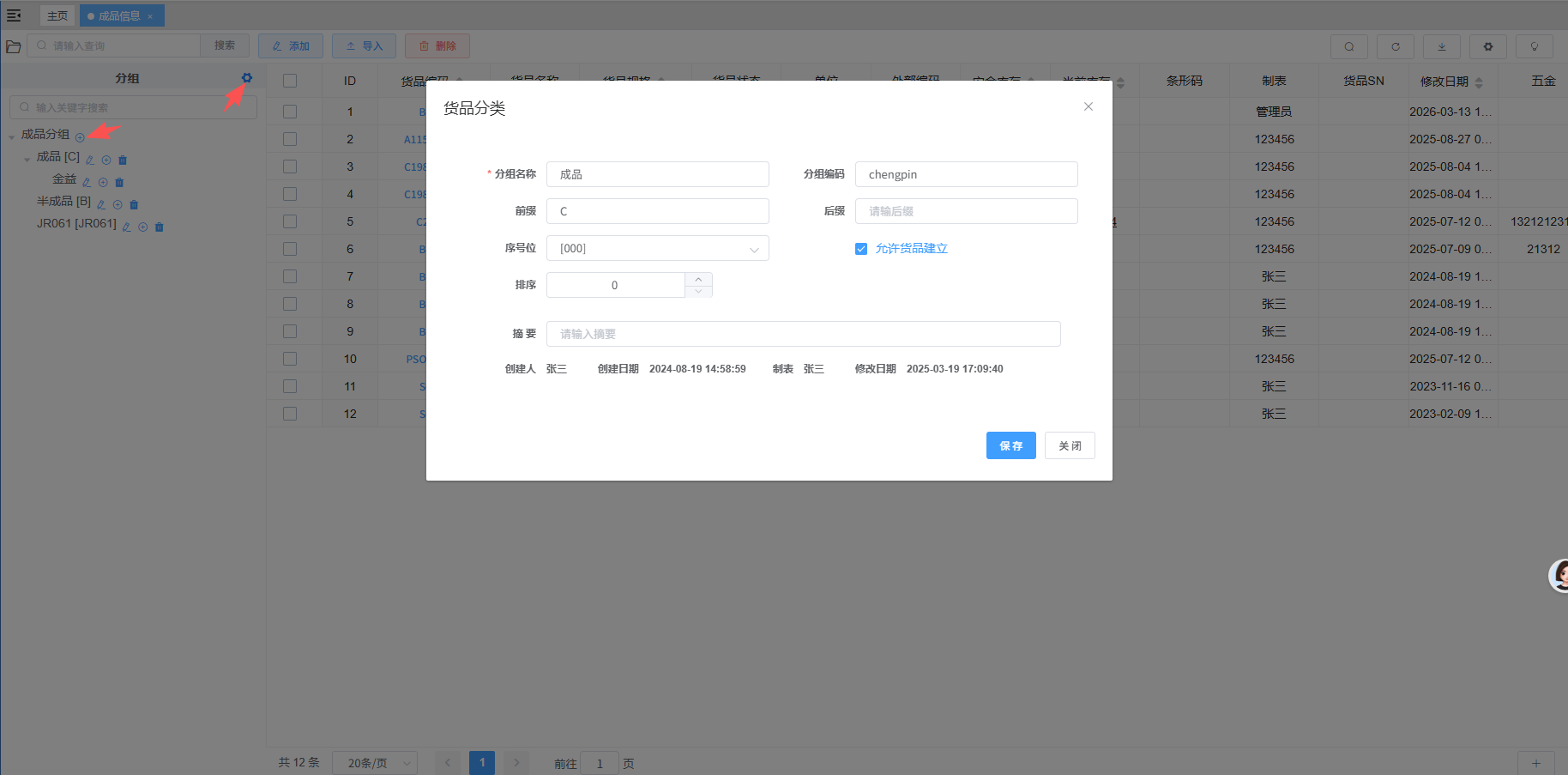 - 输入:左边进行“分组编辑”:点击“+”进行分组创建,新增分组“货品分类”(例如:成品)