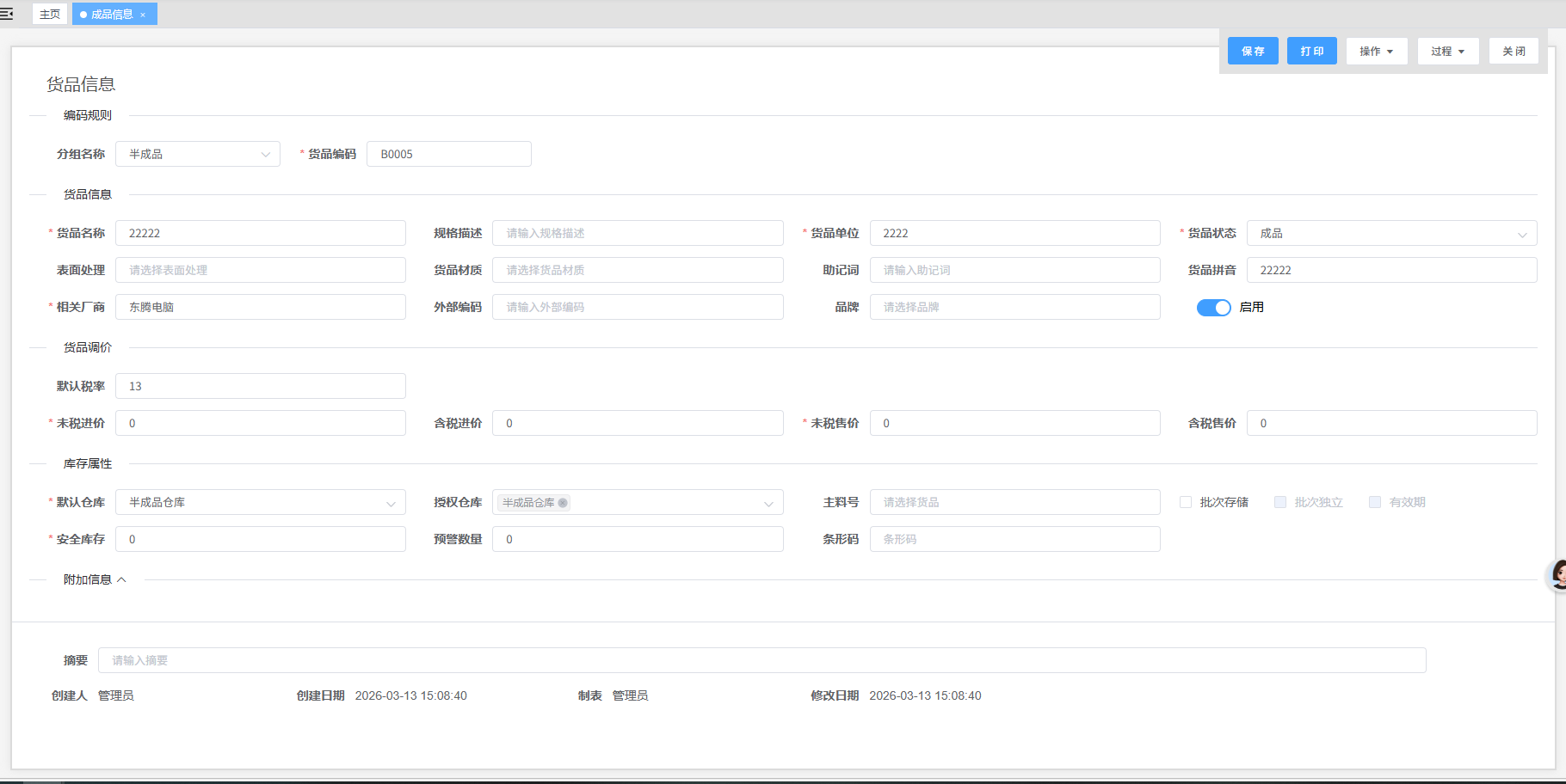 2.1、新建成品信息
