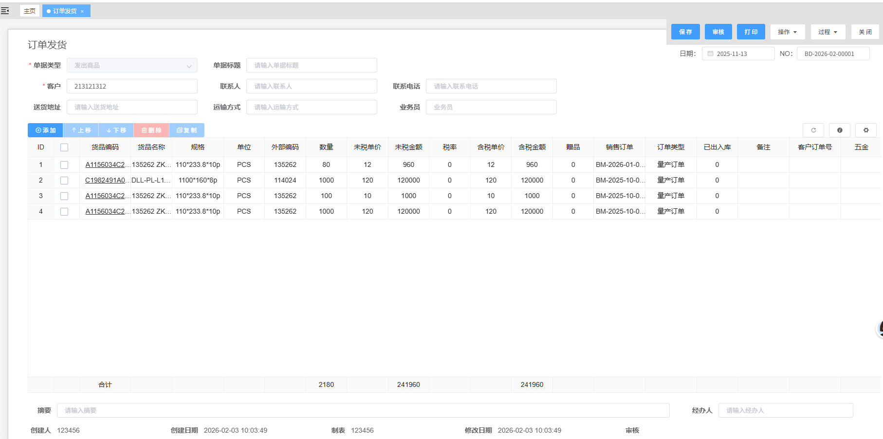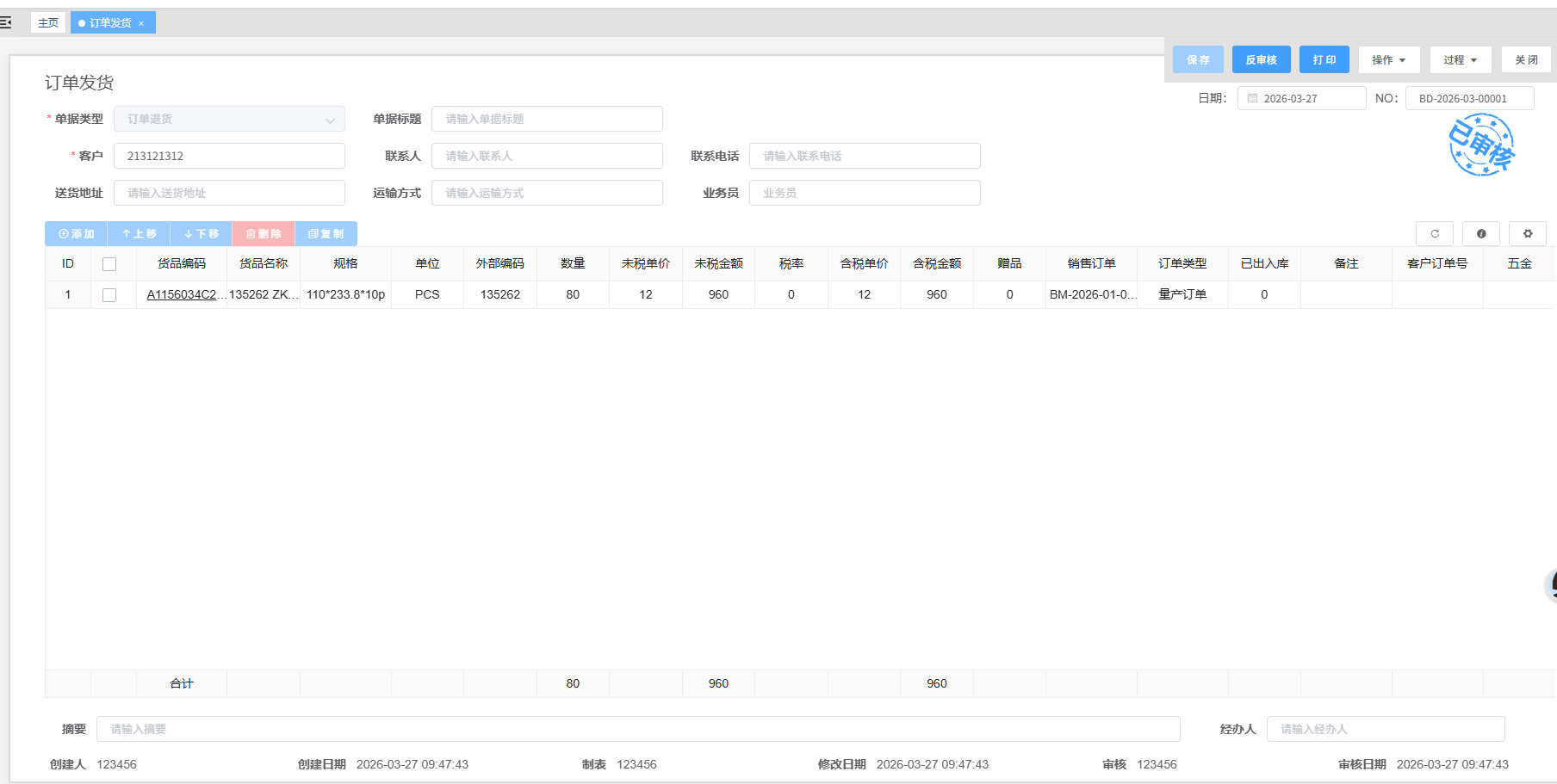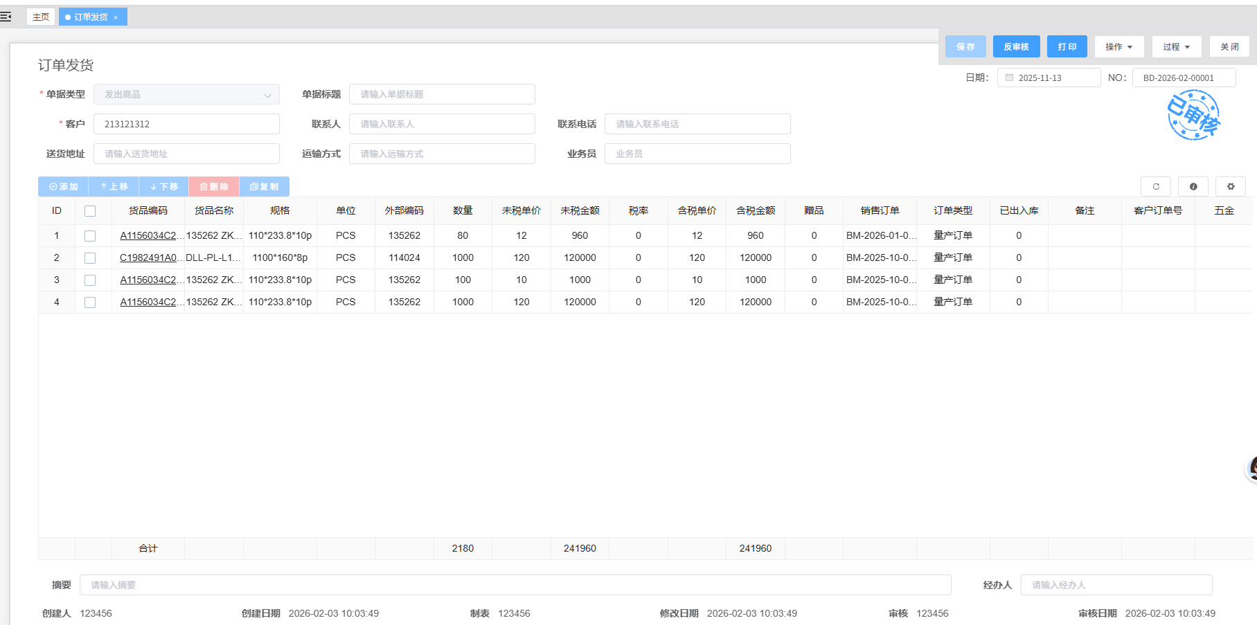 发货通知单生成: 根据“已审核”的销售订单,生成发货通知单,指导仓库备货。