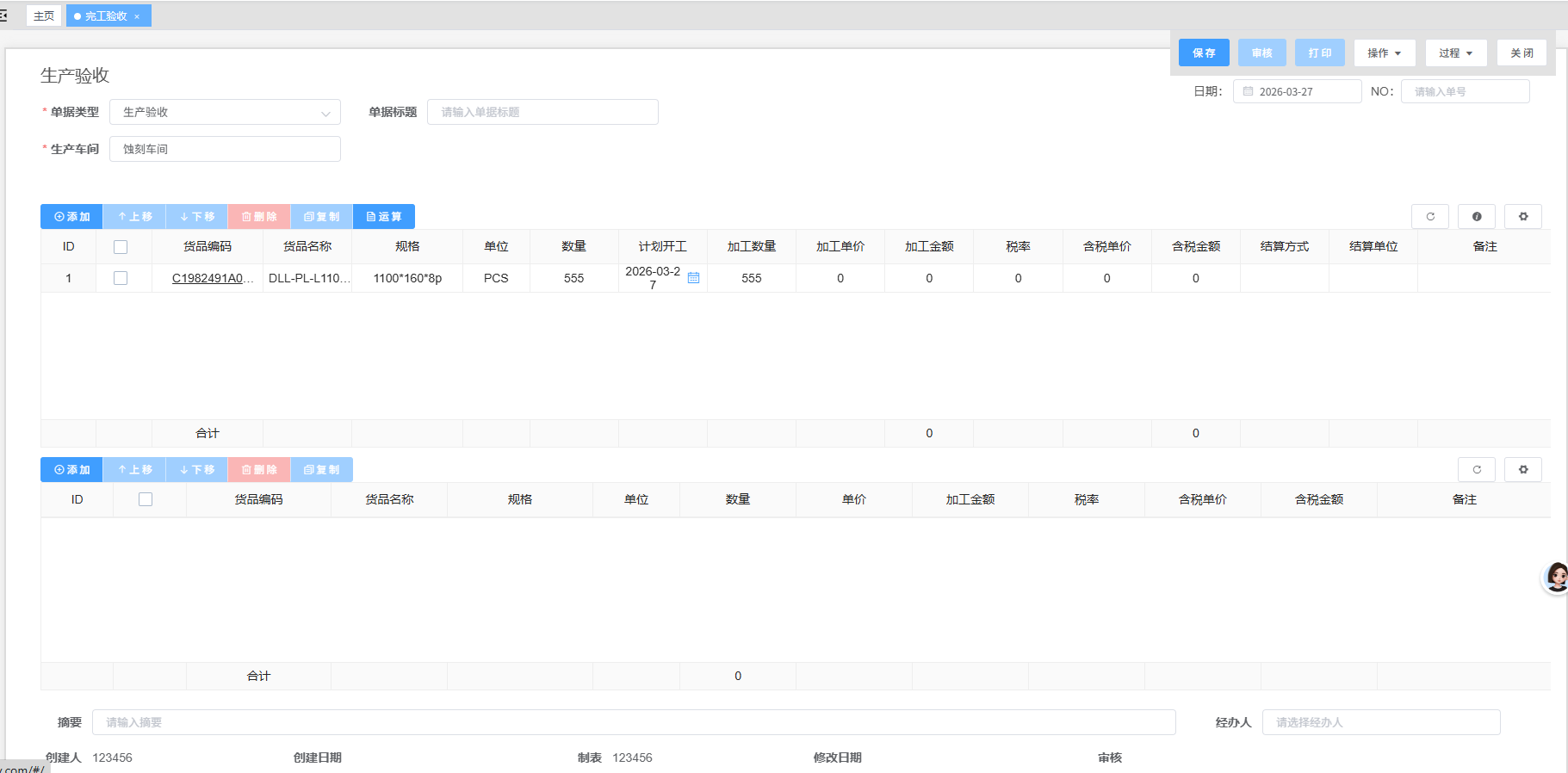 - 1. 在【生产】菜单模块,选择[完工验收]进入创建完工验收页面,点击【添加】按钮,根据实际情况创建委生产验收单据。