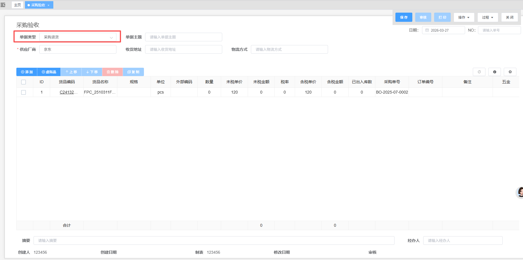 收货单创建: 系统根据PO生成收货单,只需输入实收数量。支持部分收货和多次收货。