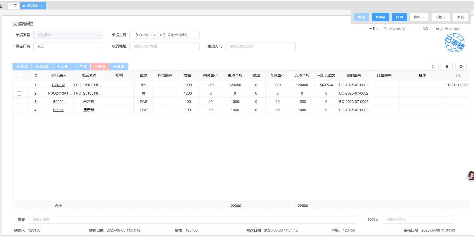库存更新: 收货确认后,系统自动增加相应物料的库存数量,库存状态可能为“待检”或“合格”。