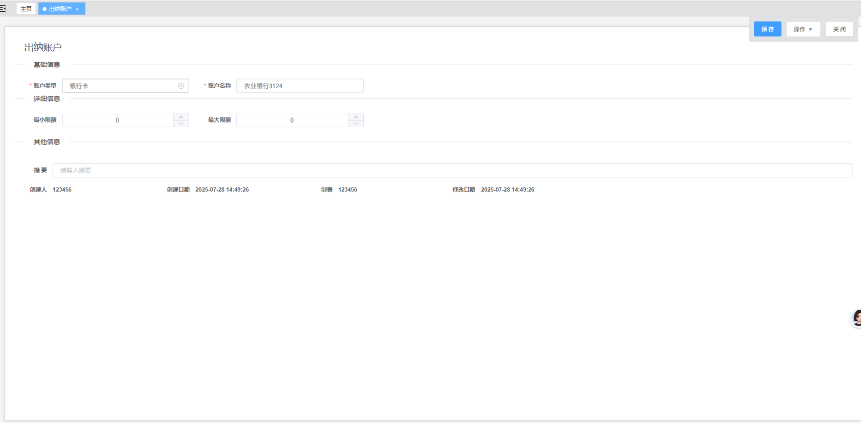 路径:“财务”模块下的“出纳账号”