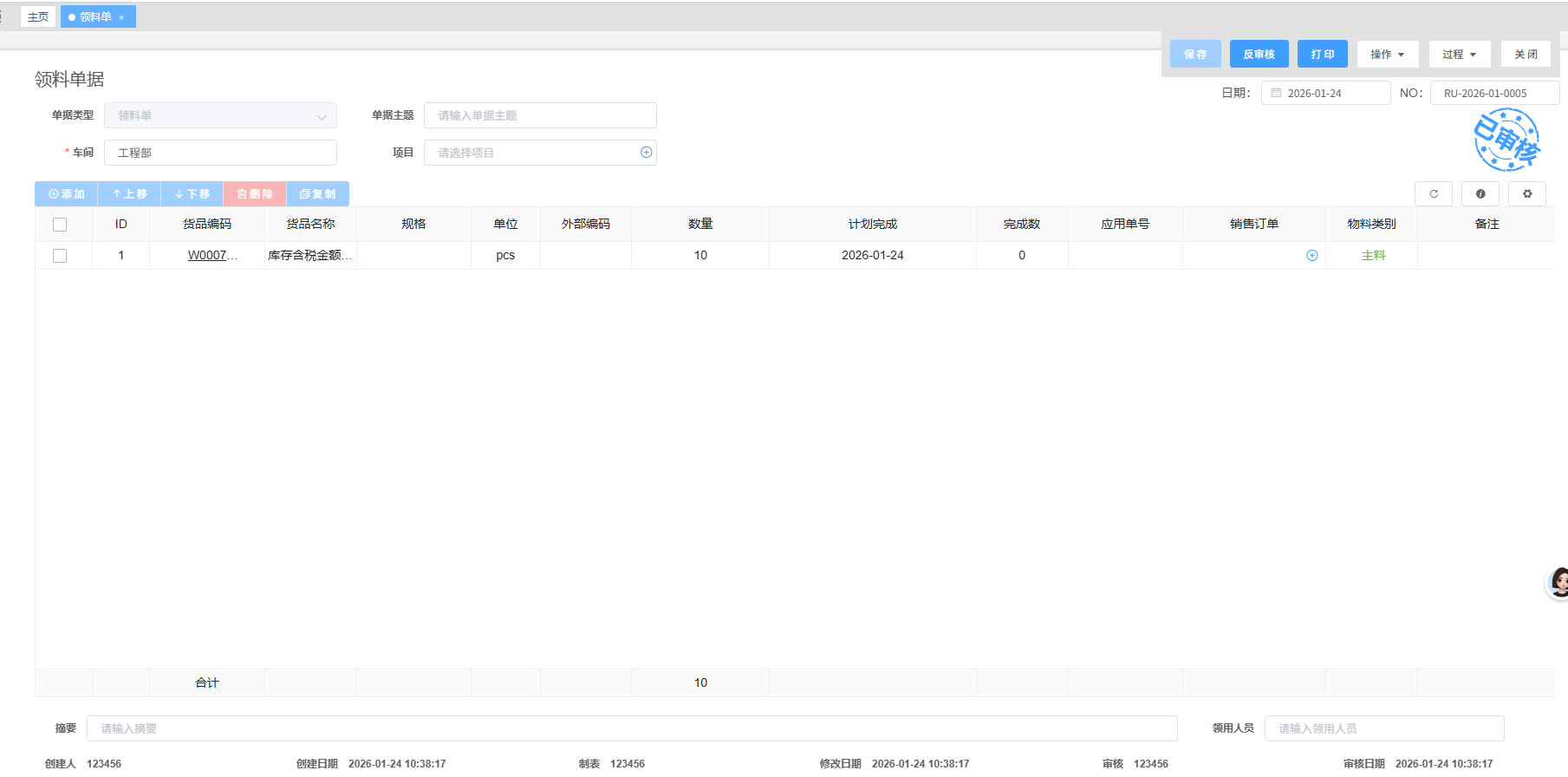 - 确认:点击上方“保存”,单据建立完成,在单据建立完成后点击“审核”