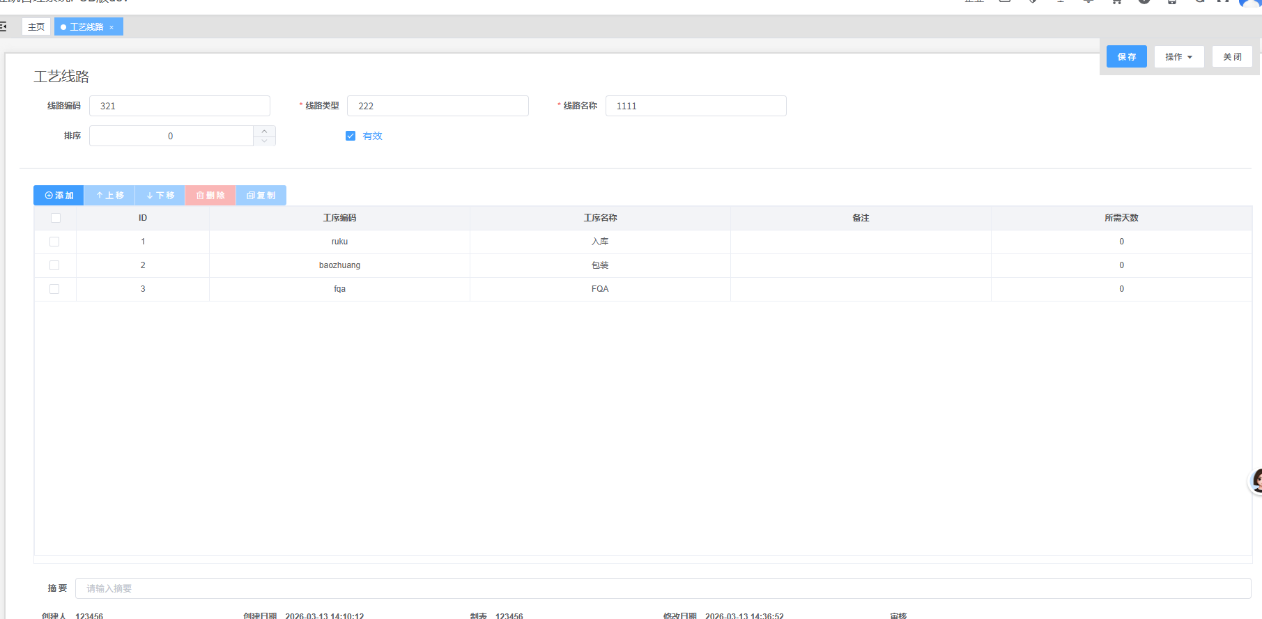 输入:点击上方“添加”,填写“编码”、“类型”、“名称”、等(名称可以在转WIP时作为工序制程的选择)