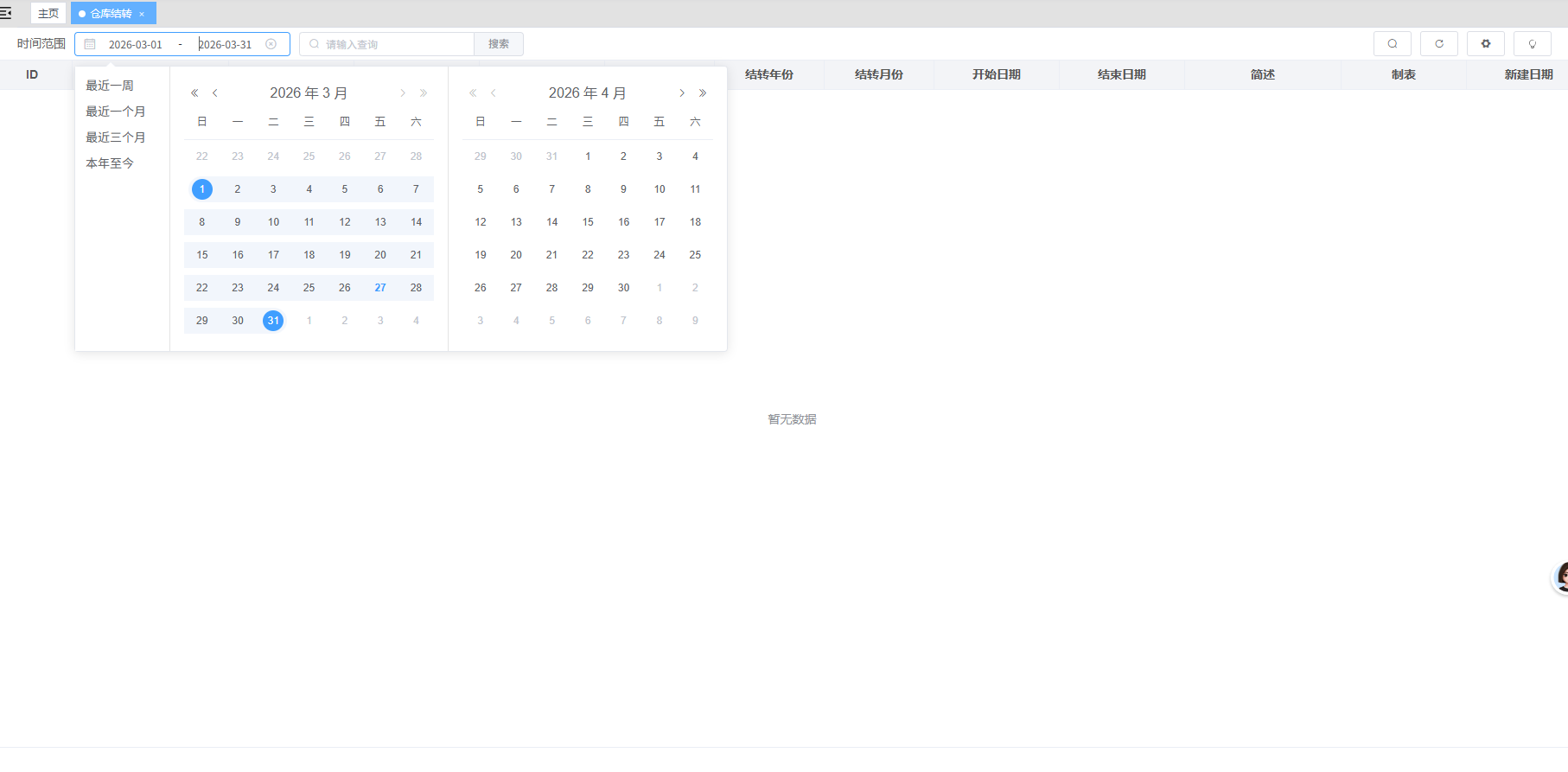 - 路径:“仓库”模块下的“仓库结转”