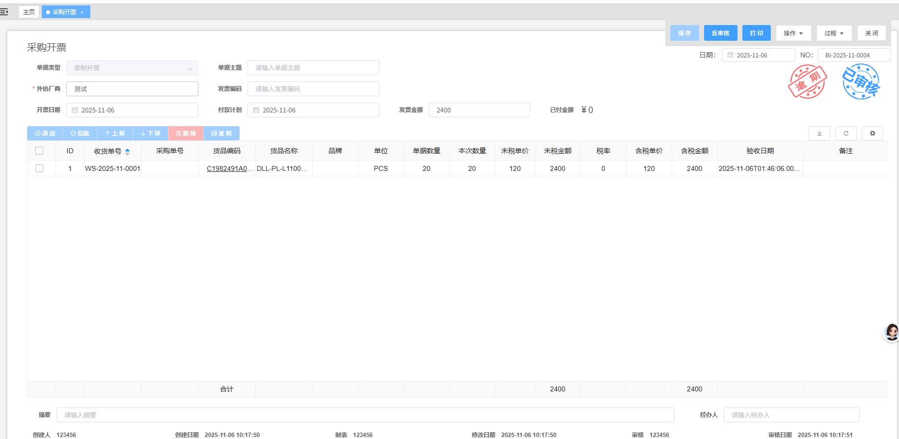 - 确认:点击上方“保存”,单据建立完成,在单据建立完成后点击“审核”