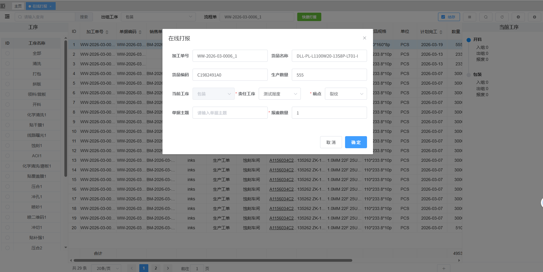 输入:选择“出组工序”,点击“流程单”,点击“快捷打报”,选择“责任工序”,“疵点”,“报废数量”