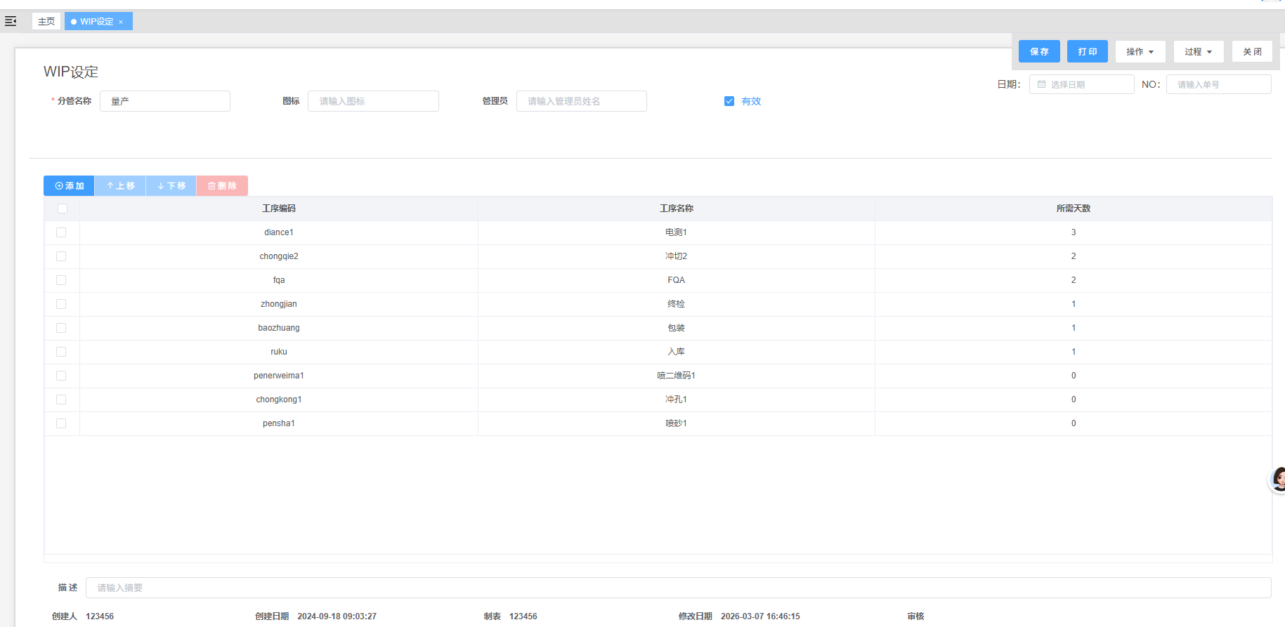 输入:点击上方“添加”,填写“编码”、“类型”、“名称”、等(名称可以在转WIP时作为工序制程的选择)